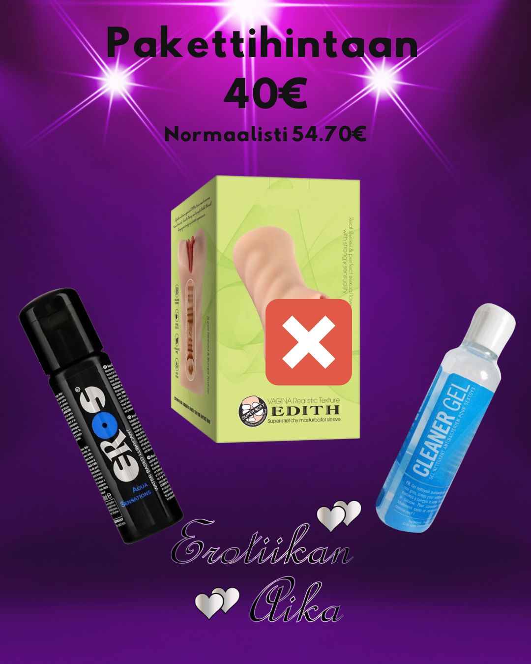 Edith tekovagina + Eros vesipohjainen liukuvoide + Lelujen puhdistusaine